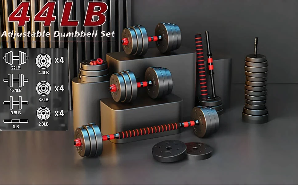 WEIGHT PACKAGE LIST - 44 lbs fitness dumbbells include: 4 × 4.4lbs weight plates, 4x3.3lbs weight plates,4 × 2.75lbs weight plates,4x dumbbell nuts,1x connertor and 2x dumbbell bar.